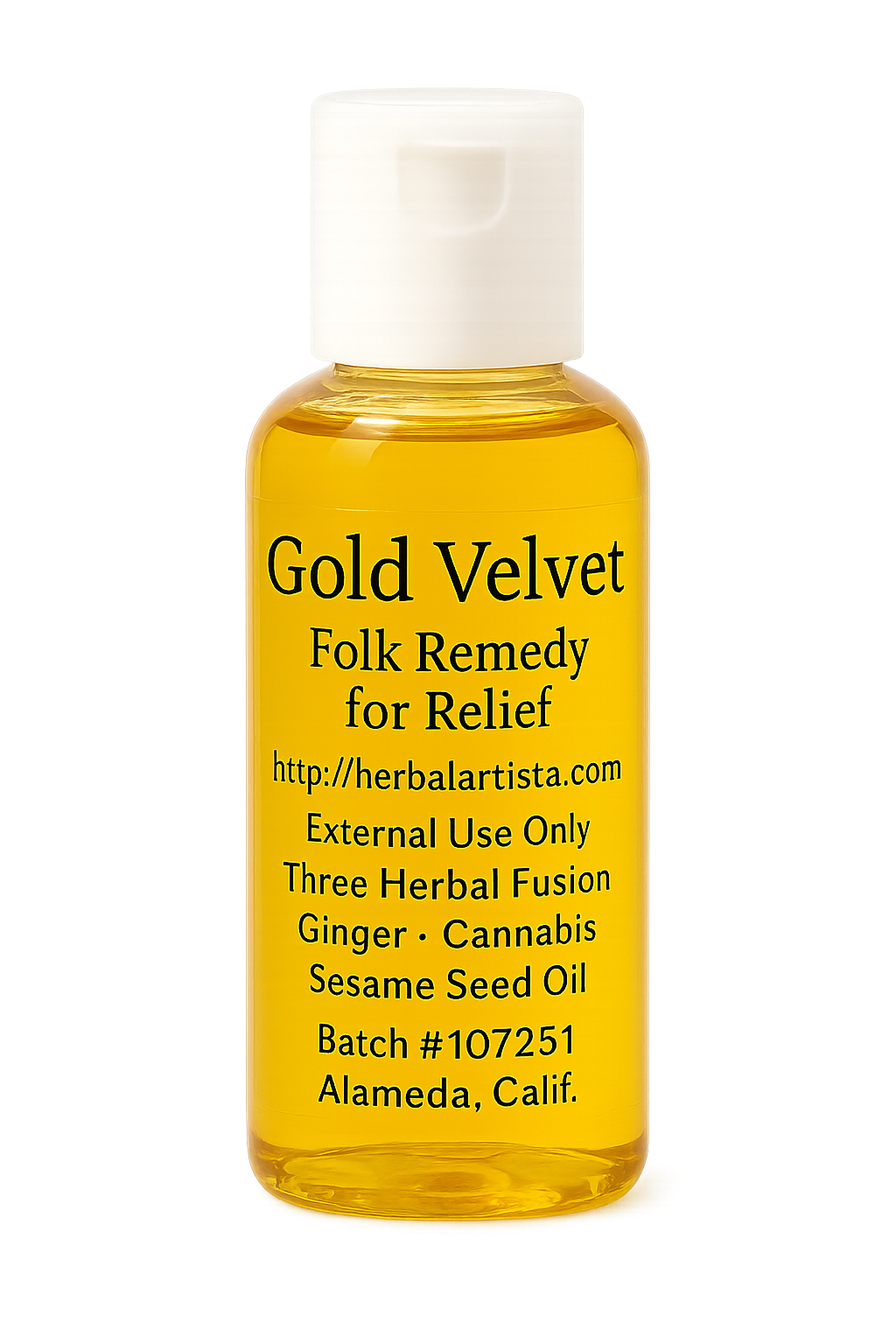 Gold Velvet™ is a handcrafted herbal oil formulated for those seeking effective, plant-based relief from joint and muscle discomfort. This traditional folk remedy blends the warming and anti-inflammatory power of ginger root with the soothing and restorative qualities of cannabis, all infused in nourishing sesame seed oil.